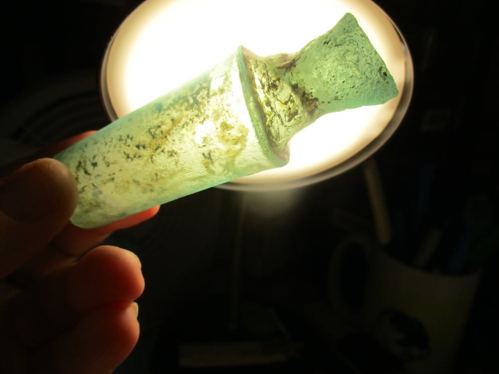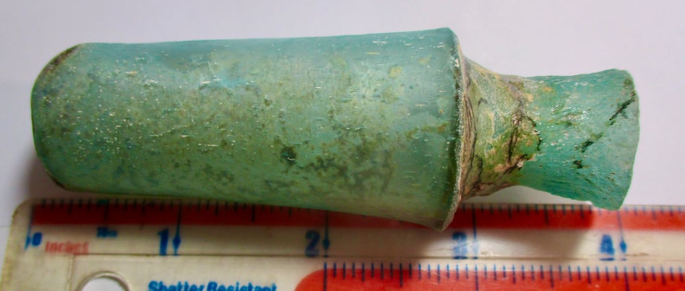 The color as made is bright and vibrant and for whatever reason, it avoided being enrusted or damaged despite its somewhat fragile construction. It's just the luck of the draw if a glass item was somehow encased inside other items or dirt that protected it and also protected it from the moisture and build up of thick coats of chemicals on top of one another. Please take a close look at the group of 4 in the photo to get an idea of not only the relative size but also how each survived so long in one piece.